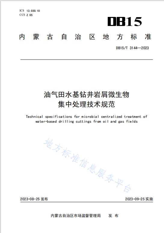 日前,由内蒙古恒盛环保科技工程有限公司参与编制的《压裂返排液集中处理技术规范》(DB15/T 3143-2023)、《油气田水基钻井岩屑微生物集中处理技术规范》(DB15/T 3144-2023)两项地方技术规范经内蒙古自治区市场监督管理局批准发布,2023年9月25日起正式发布施行。