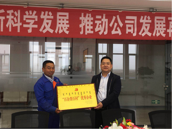 组织部副部长赵鹏为我公司颁发了“百企帮白村”优秀企业奖牌、赠送了《新时代党的农村基层组织工作的基本遵循》、《初心和使命十讲》、《乌审旗非公企业和社会组织党支部规范化建设指导手册》、《关于进一步推进全市各领域党支部规范化建设的意见》(试行)等一系列学习资料,希望我们紧跟党的步伐,不忘初心、砥砺前行,贯彻落实党的路线、方针、政策,做好支部规范化建设工作及基层组织工作。